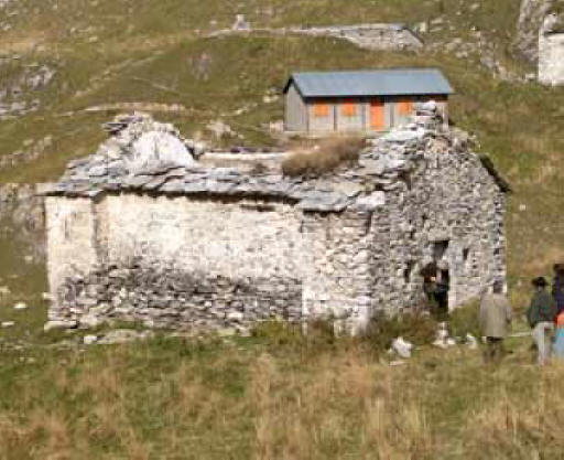 Il tetto, fino ai recenti restauri, era in lastre di pietra scistosa locale (ciape), progressivamente copertosi di zolle erbose.